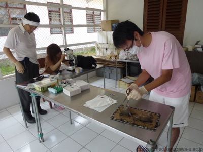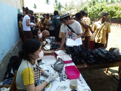 調査概要:学校健診で採取した学童便を材料に、寄生虫の顕微鏡検査を実施しました。サンプル収集と顕微鏡検査には日本人学生と現地保健関係者が共同であたり、日本人学生には寄生虫検査の実地体験を、また現地関係者には寄生虫症対策構築のためのエキスパート教育を提供しました。さらに日本では卒業研究の学生が遺伝子スクリーニング法をもちいた寄生虫同定を進めています。