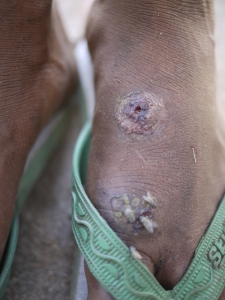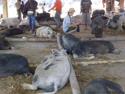 ④ 結果:144名(男子74名、女子70名)の学童の便検体を収集し、また動物便としては、野鼠、豚、山羊、犬などの合計87検体を採取しました。ヒト便検体の顕微鏡検査では、回虫(かいちゅう)55(38.2%) 、鞭(べん)虫(ちゅう)16 (11.1%)、鉤(こう)虫(ちゅう)4 (2.8%)、鞭(べん)毛虫(もうちゅう)14 (9.7%)、アメーバ類31 (21.5%)、ブラストシスチス(26.4%)と極めて高度な寄生虫のまん延を認め、動物サンプルからは、さらに多くの寄生虫感染を検出しました。寄生虫がヒトと動物の間で感染環を維持(人獣共通感染)しているかどうかを判断するには、遺伝子レベルでの寄生虫解析が必須なため、この調査で得られたDNAサンプルを用いた分子解析が卒業研究の学生や大学院生らによって進行中です。