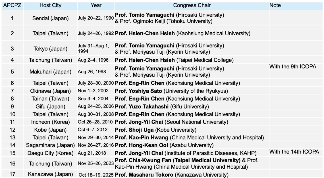 Asian Pacific Congress for Parasitic Zoonoses (APCPZ) was established in 1990, when the 1st APCPZ conference was held in Sendai City, Miyagi Prefecture, Japan. The president of this inaugural conference was Professor Tomio Yamaguchi, an emeritus professor at Hirosaki University.- Since then, the APCPZ has been held biennially, alternating primarily between Japan and Taiwan. In 2010, the congress was hosted for the first time in a third country—Incheon, Korea—reflecting the growing participation of Korean parasitologists. Since that time, APCPZ has continued to rotate among these three countries every two years, except during the COVID-19 pandemic period.